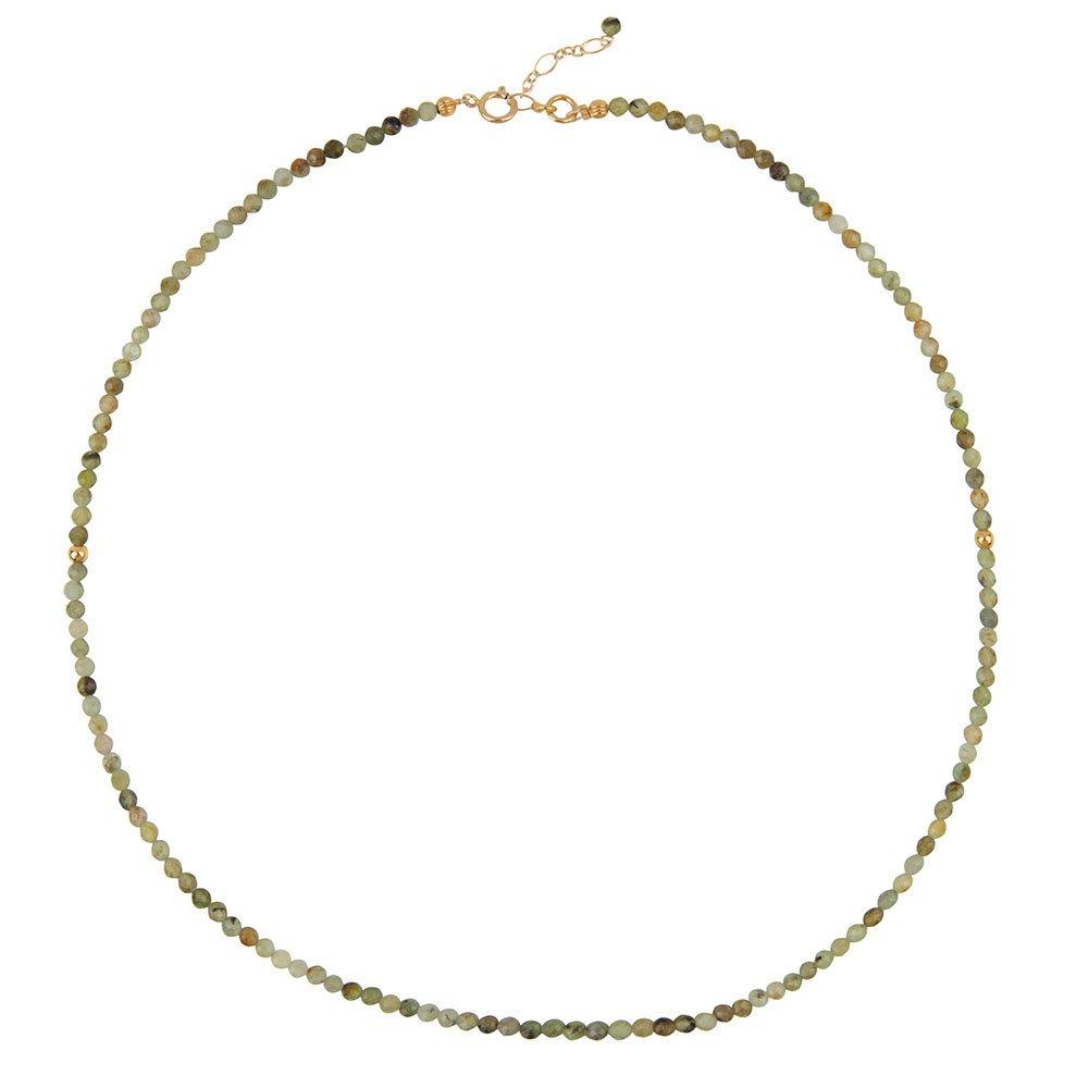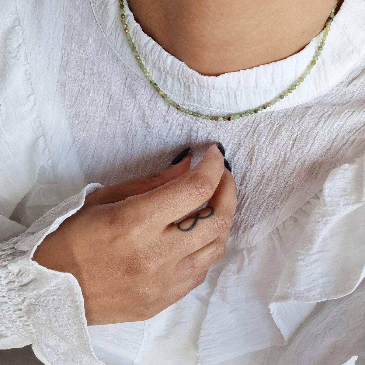 Zelena kratka ogrlica iz granatnih dragih kamnov. Zeleni granat je čudovit kamen za uravnoteženje prijateljstva in odnosov ter za poglabljanje vaše ljubezni in strasti.